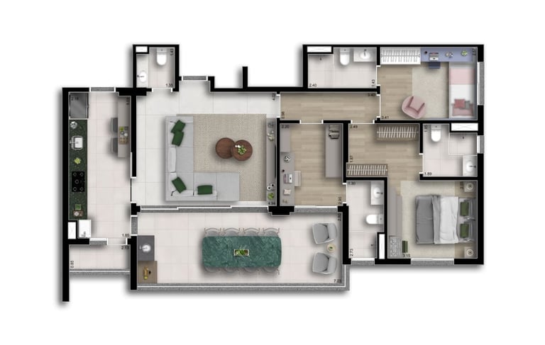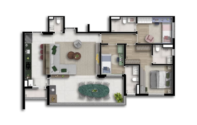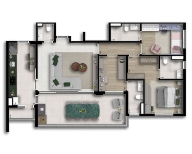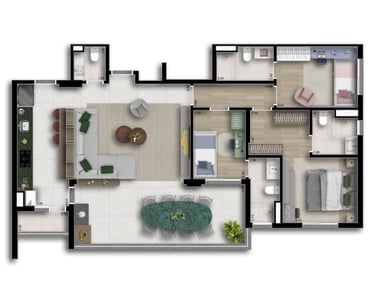 Apartment Floor Plan with 3 Suites, Integrated Kitchen, 1190ft² private space + 32.3ft² storage space. 12th to 22nd floors. With decoration suggestions. Furniture, appliances, electronics and decorative elements are not part of the unit purchase and sale agreement. Face-to-face measurements. Subject to additional cost and consultation request deadline.